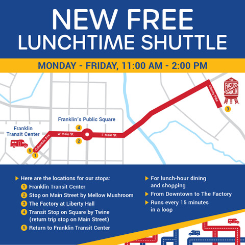 Lunchtime just got more exciting in Franklin with the launch of a new free pilot shuttle service connecting Downtown Franklin and The Factory. Beginning September 15, the shuttle will run every 15 minutes between 11:00 a.m. and 2:00 p.m., making it easier than ever to enjoy lunch, shopping, and exploring both Main Street and The Factory destinations. The shuttle loop will start…